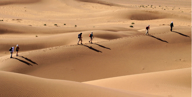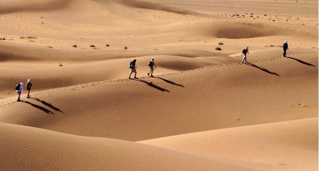 C’était une journée comme les précédentes de cette semaine de trek estival dans l’erg Zahar-M’Hamid où il faisait très beau : le soleil, la chaleur, le désert, toujours le sable. Une journée comme ses sept jumelles antérieures où s’enchaînaient marche, repos, marche, ravitaillement, marche bivouac… Sept jours où nous n’avions vu que du sable : aucune présence humaine à part notre minuscule groupe, ni témoin de civilisation fixe à l’horizon : pas de pont ni de route, encore moins des bâtiments. Hormis des toiles pour dresser nos tentes, nos outils rudimentaires de cuisine et nos téléphones, rien d’artificiel autour de nous, ni ombre de végétation ni aucun animal à part des oiseaux rodeurs à des hauteurs élevées à la recherche de traces de restes de vie à mettre sous le bec…
